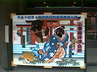 この看板の関係者の方からのお知らせメールで期間限定の歌舞伎の顔出し看板の撮影に成功! 35mmがよりによって調子悪く、ロカティオで撮影・・・。うーむ、残念。ディテールが良くわからん。 写真ではわかりにくいですが、結構大きめ。良くできた看板で、顔の部分は表情を描いた布が普段は垂れ下がっており、撮影時には、それをのけて自分の顔を出す方式。 |