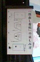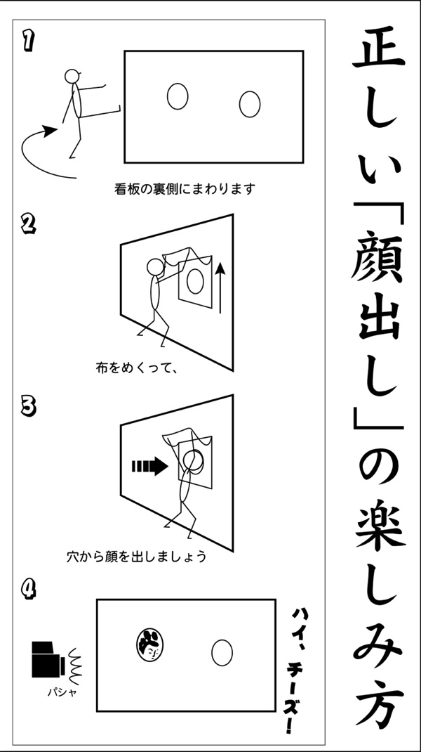 | 見よ! 顔出し看板の撮影のし方が解説されている。 図が滑稽で楽しい。ロカティオでの撮影はわかりにくく、お見せできないのが残念。 と、思っていたら実際にこれを作成した東京都のK氏より画像が到着!右の写真をクリックすれば拡大して見ることがきます。感謝! |